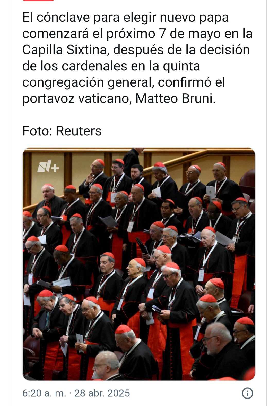 08:30 hora de México: inicio del cónclave