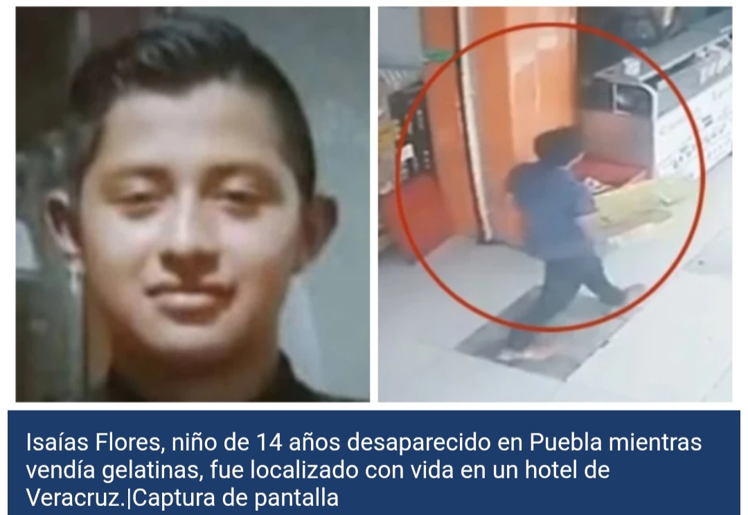 - Isaías Flores, niño de 14 años desaparecido en Puebla mientras vendía gelatinas, fue localizado con vida en un hotel de Veracruz tras casi un mes de búsqueda.