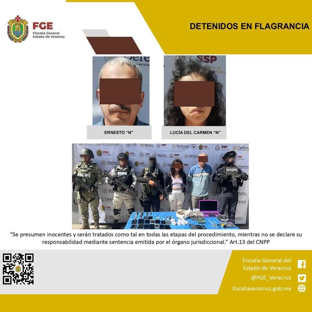 Xalapa, Ver., a 5 de febrero del 2025.-La Fiscalía General del Estado informa que, Fiscales, Peritos y Policías Ministeriales con sede en Coatepec, en coordinación con la Secretaría de la Defensa Nacional, Guardia Nacional y la Secretaría de Seguridad Pública Estatal, detuvieron en flagrancia a Ernesto “N” y Lucía del Carmen “N”.